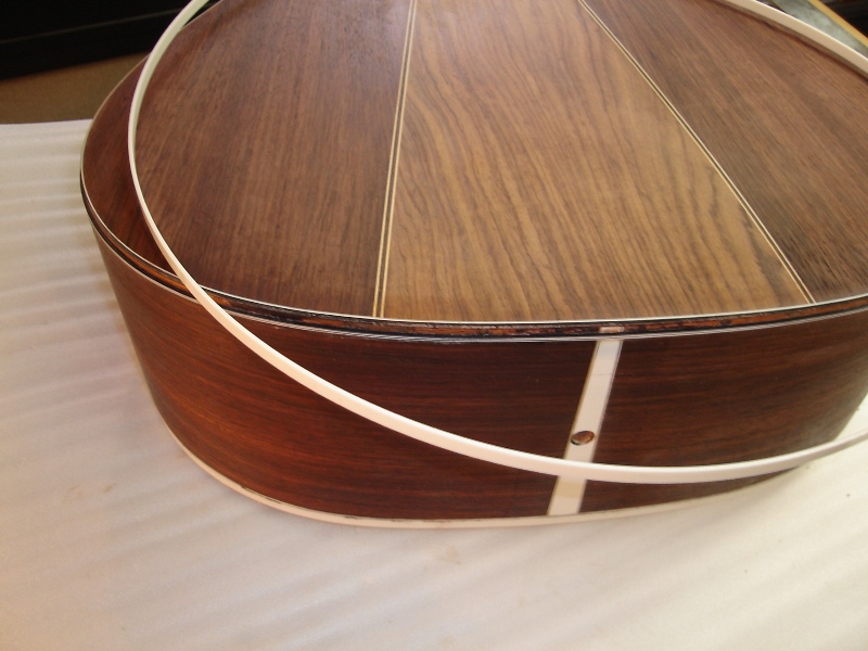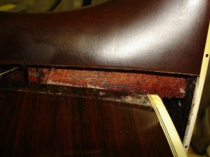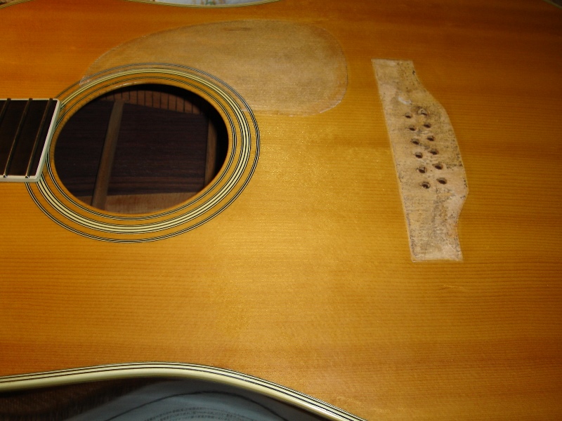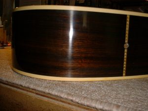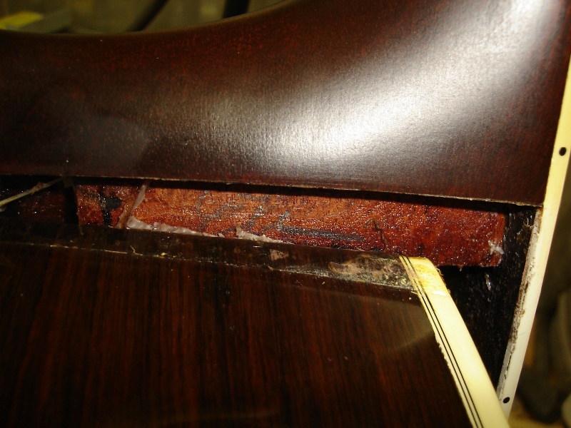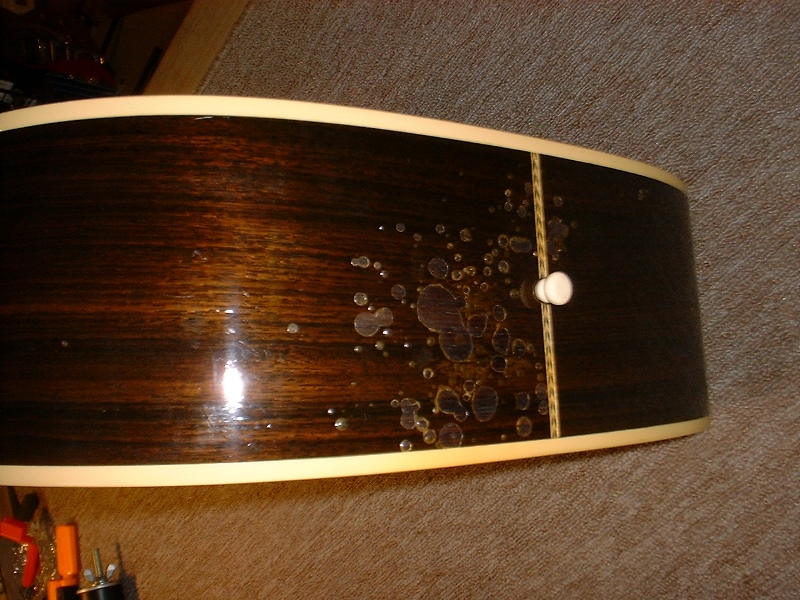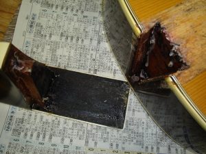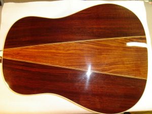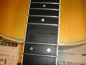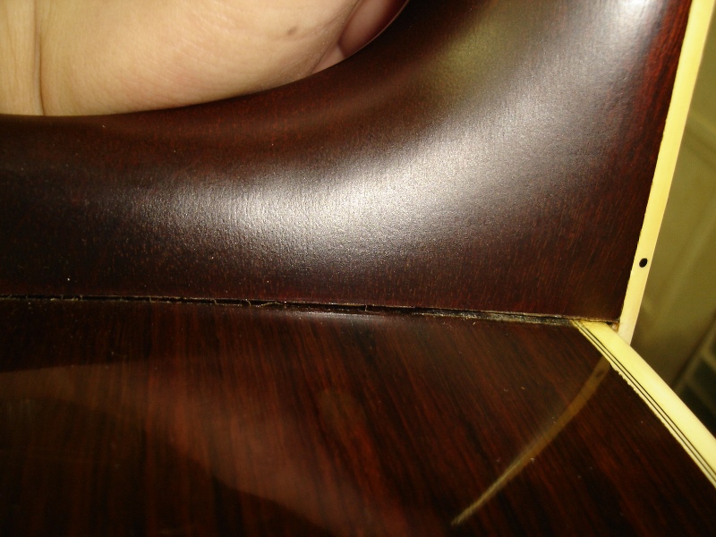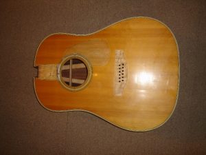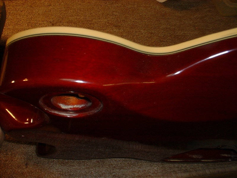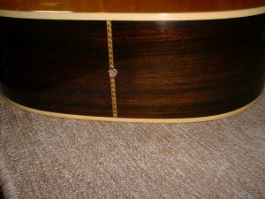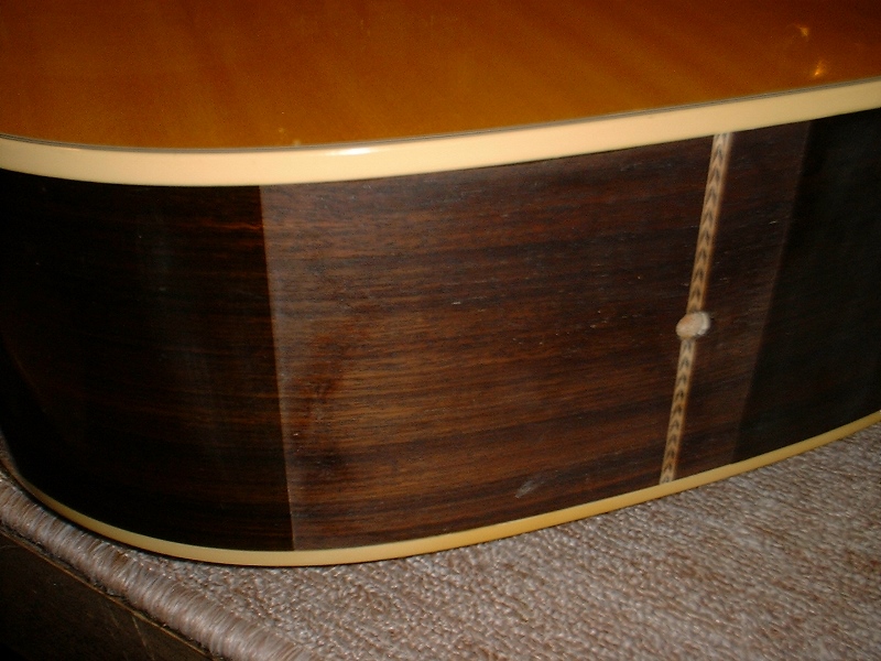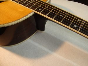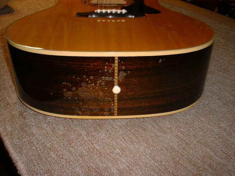 メーカー ギルド モデル名 D-50 年代 1980 作業内容 ボディ・サイド 塗装修正 石油ストーブの熱によって溶けてしまったボディサイドの塗装を部分的に剥がしローズウッドの生地を出して、部分的に一から塗装をやり直しました。