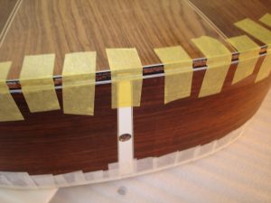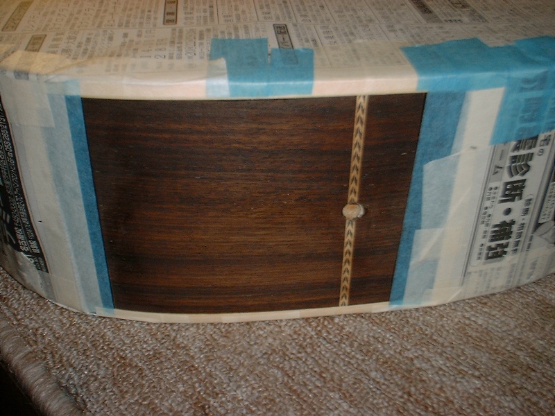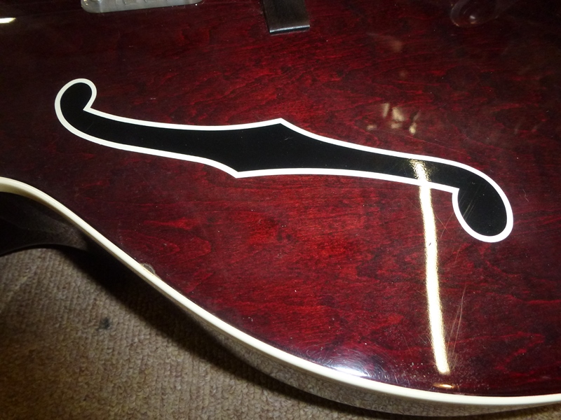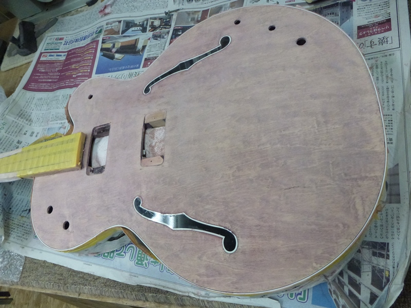 2つあるFホールはサウンドホールではなく、ペイントされたものですので、Fホール部分は剥がさずに残します。