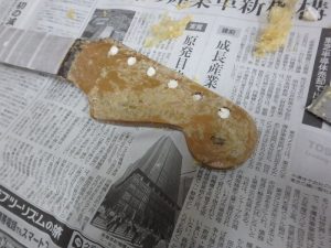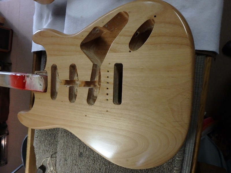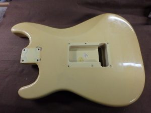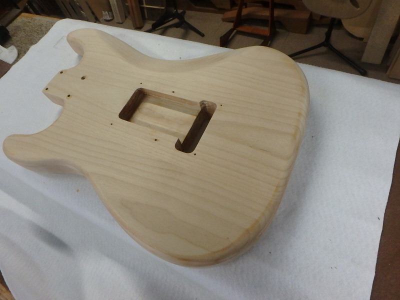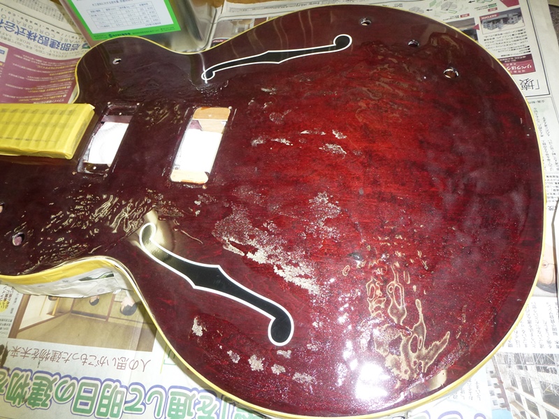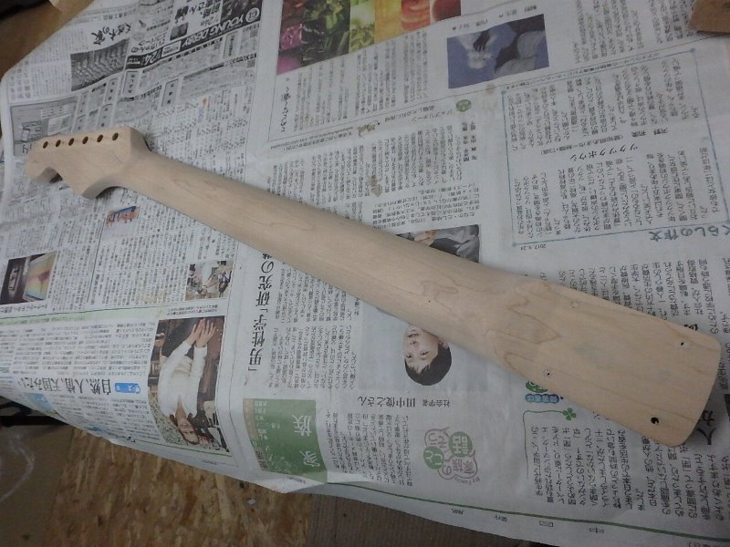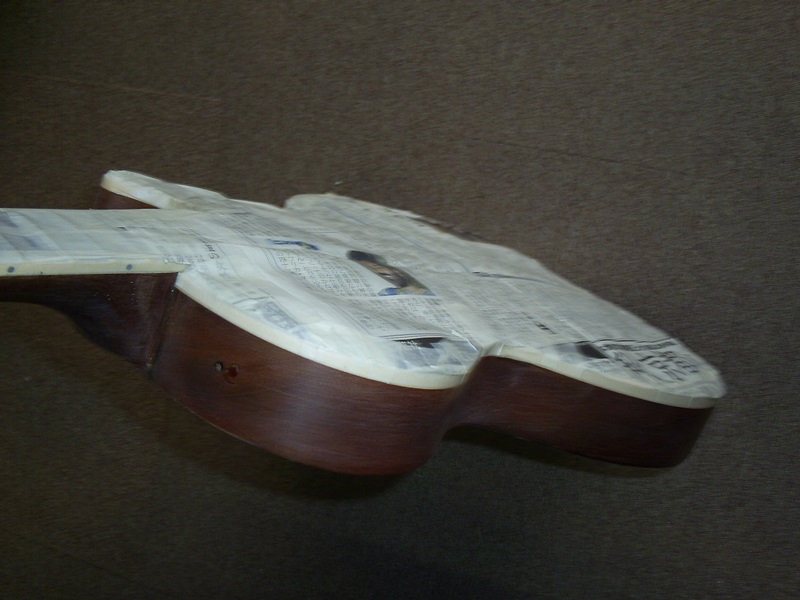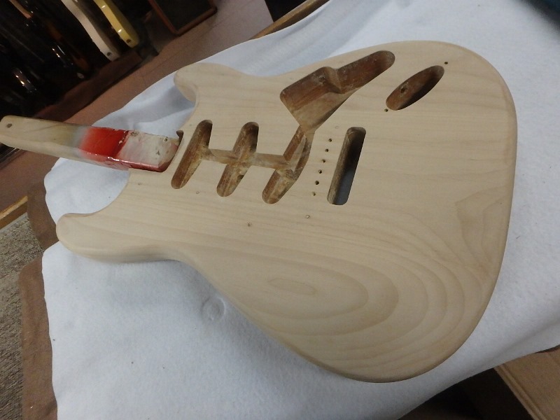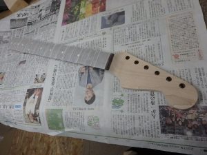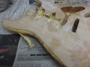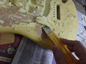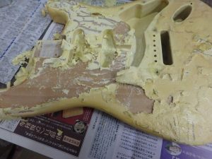 ネック・ボディ共に一度塗装を剥ぎ生木の状態に戻します。