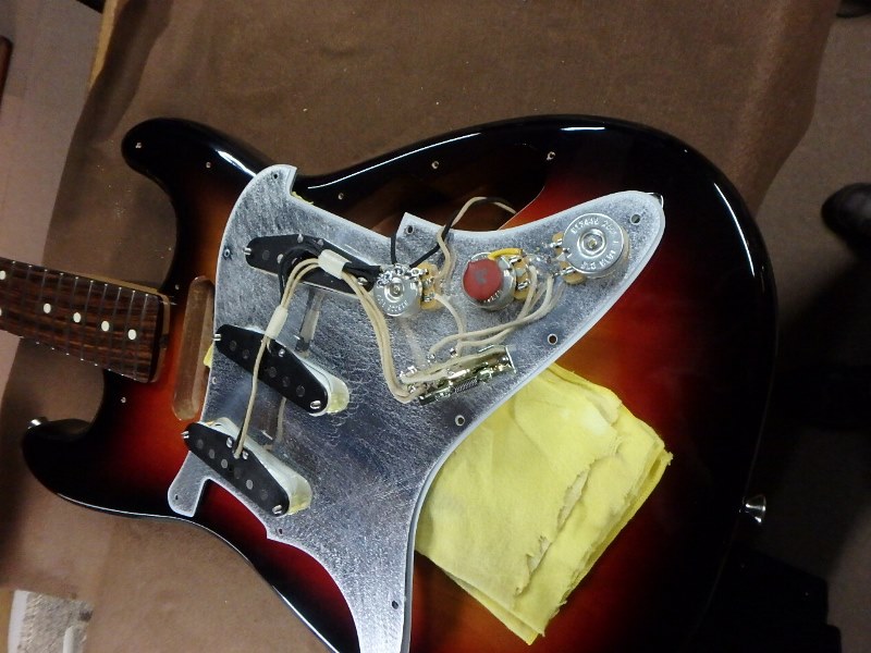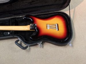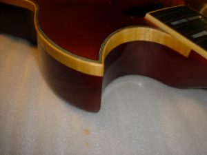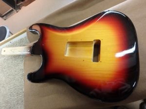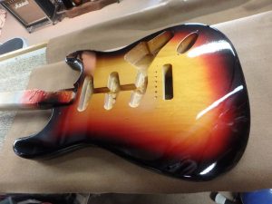 赤色の部分が太い60年代前半の3トーンサンバースト、オールドのイエロー部分は漂白により木目が透けていませんが、今回は木目が透けるように着色。元々の下地にポリウレタンが使われていましたが、下地からのオールラッカーでリフィ二ッシュいたしました。 -
