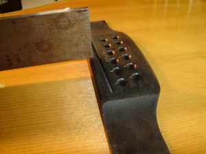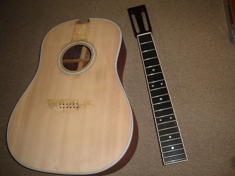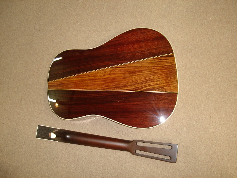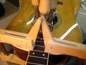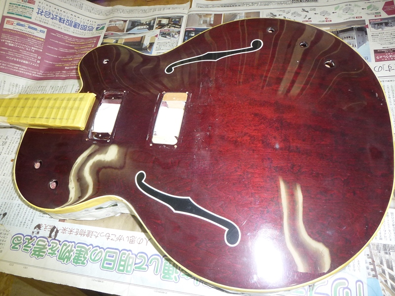 マーチンの様にネックとボディを別々に塗装し他後に組み込まれたギターは再塗装の時もネック、ボディ、ブリッジ、ピックガードを外してから作業を行います。