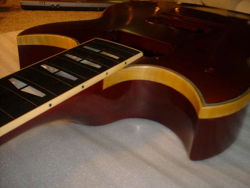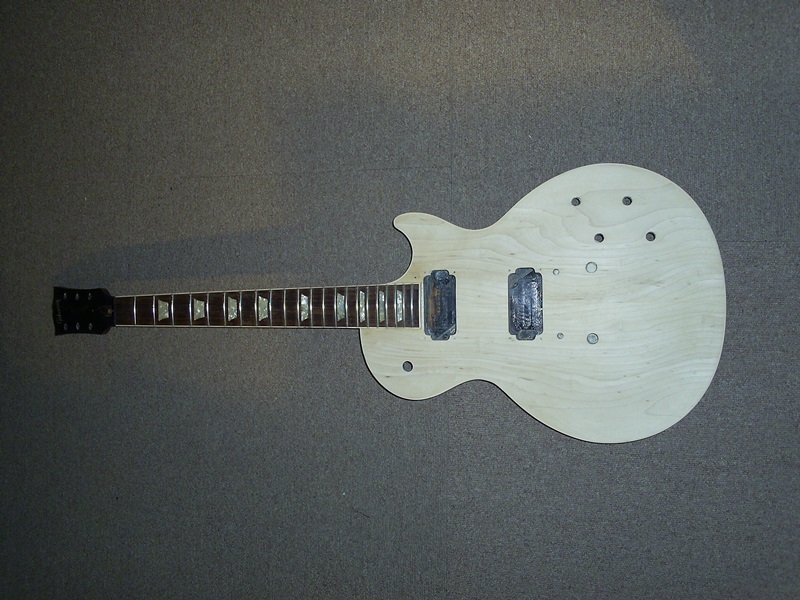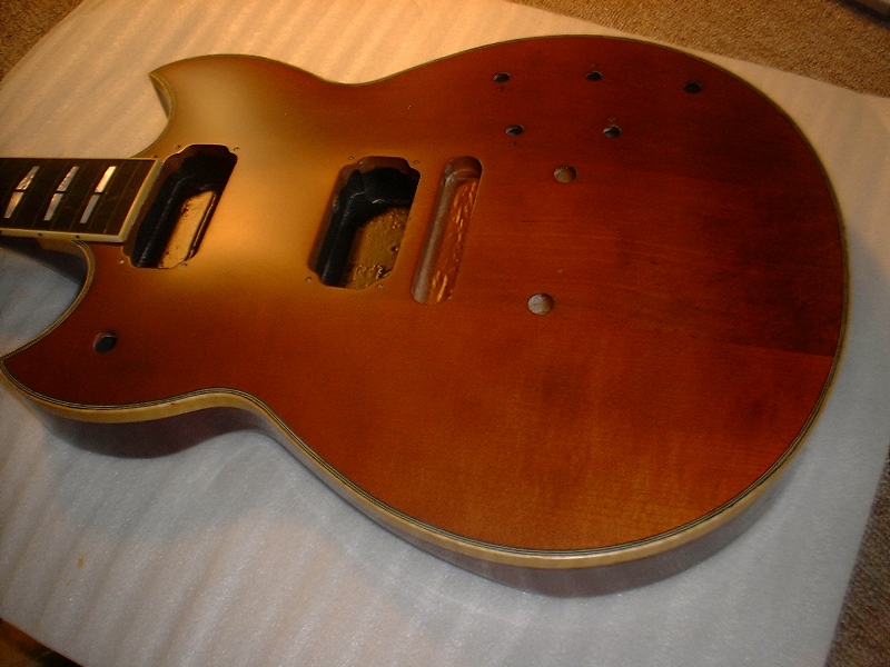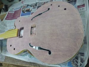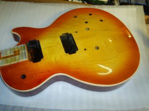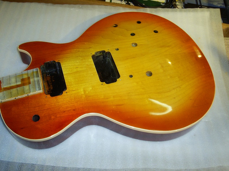 ボディトップの塗装を剥がし、一度メイプルの生木の状態まで戻して、ツヤ消しのブラウンで仕上げました。